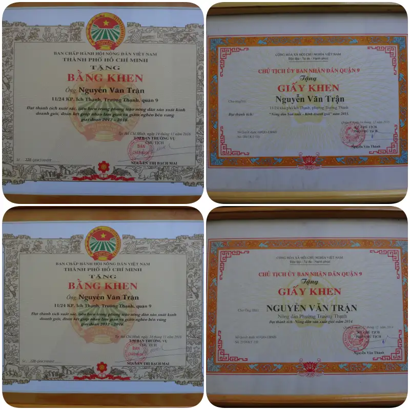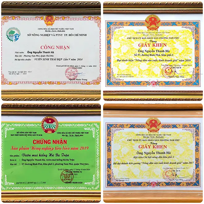 Hơn 50 năm gắn bó với Cây Mai bonsai và các loại cây khác. Nghệ nhân Nguyễn Văn Trận được đón nhận nhiều bằng khen, huân chương lao động hạng 2, huân chương vì sự nghiệp VAC, huân chương hội nông dân việt nam 1930-1995, huân chương vì sự nghiệp nông nghiệp và phát triển nông thôn và nhiều huân huy chương …v……v……khác.
